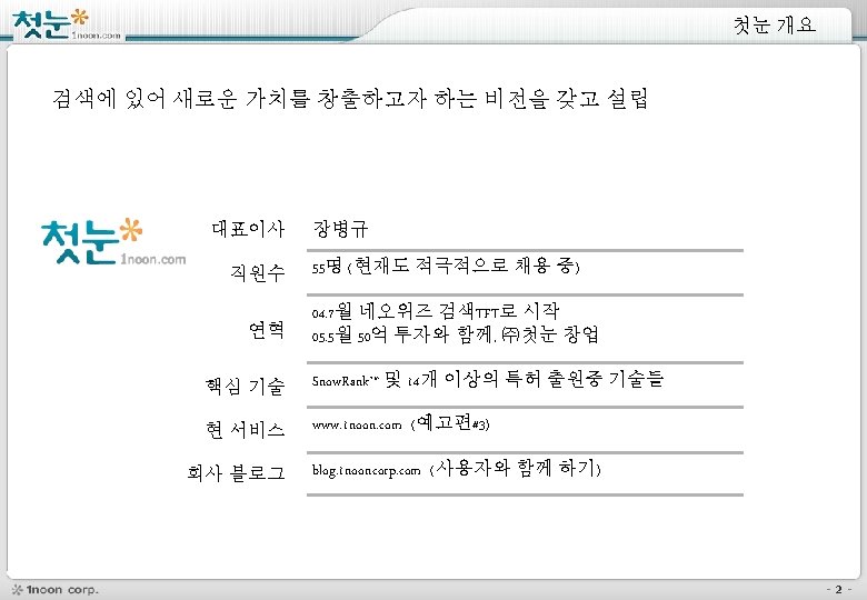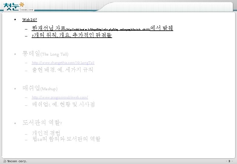 웹 2. 0의 함의, 그리고 도서관의 역할 2006. 4. 26 ㈜첫눈 대표, 장병규 KESLI 전자정보 포럼 2006 Copyright 2005 1 noon corp. All Right Reserved. -1 -