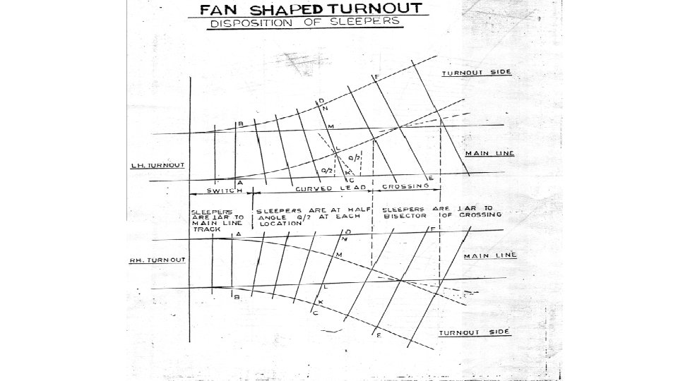 Turnouts on Concrete Sleepers • Breakthrough § In 1990 – Development of Fan-Shaped Layout • Features § Inter changability for LH as well as RH Turnouts § Lead portion Sleeper spacing § More on outer side than on inner side measured along gauge faces of Main Line rails § Resemble fan “Fan Shaped Layout”