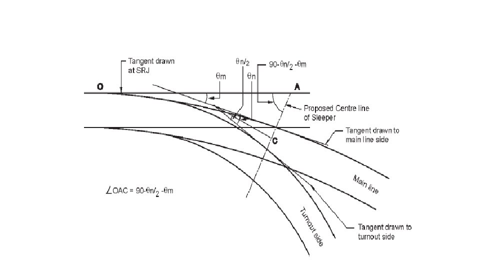Orientation of sleepers when turnouts laid in curves • while laying the turnout on the curve, the tangent drawn to the main line is also changing direction along with the location. • The tangent drawn to the main line of turnout at the location of sleeper makes an angle of θm with the tangent drawn to the SRJ. • To maintain sleeper perpendicular to the bisector of the angle made by tangents drawn to main line and turnout side, the sleepers will also be required to be further rotated by an angle equal to the θm since it makes an angle of (90 -θn/2 -θm) with the tangent drawn to SRJ.