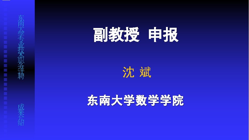 东 南 大 学 专 业 技 术 职 务 评 聘 沈斌 任现职以来科研 作 Ø Ø 主持的科研项目(2项) 科研论文 共 14篇 其中SCI检索的第一作者论文11篇,通讯作者论文1篇 Finsler旋流形的几何特征和物理应用 Finsler 几何中的椭圆算子与曲率流 ① ② ③ 国家自然科学基金青年项目 (在研) 江苏省自然科学基金青年项目 (结题) Shen, B. , Strong maximum principle for a Finsler-Laplacian. Houston ⑨ Shen, B. ; Tian, Y. , Rigidity theorems of some dually Flat Finsler Journal of Mathematics 2019, 45 (4), 1089 -1117. Shen, B. , Strongly and weakly affine vector fields on Finsler manifolds. Differential Geometry and Its Applications 2019, 62, 190 -211. ØShen, 参与的科研项目(2项) B. , Holomorphic vanishing theorems on Finsler holomorphic vector bundles and complex Finsler manifolds. Canadian Mathematical Bulletin Canadien De Mathematiques 2019, 62 (3), 623 -641. Shen, B. , Vanishing of projective vector fields on compact Finsler manifolds. Journal of the Korean Mathematical Society 2018, 55 (1), 1 -16. Shen, B. , Vanishing of killing vector fields on compact Finsler manifolds. Kodai Mathematical Journal 2018, 41 (1), 1 -15. Shen, B. , S-closed conformal transformations in Finsler geometry. Differential Geometry and Its Applications 2018, 58, 254 -263. Ni, P. ; Shen, B. *, On variation of action integral in Finsler gravity. Annals of Physics 2019, 404, 93 -114. Shen, B. , Frankel's refinement of Bochner's theorem on forward complete Finsler manifolds. Differential Geometry and Its Applications 2017, 51, 65 -75. ⑩ k metrics and its applications. Bulletin of the Korean Mathematical Society 2016, 53 (5), 1457 -1469. Shen, B. , Twisted Ricci flow on a class of Finsler metrics and its solitons. Differential Geometry and Its Applications 2016, 46, 132145. Shen, B. ; Shen, Y. ; Zhang, X. , Holomorphic maps from Sasakian manifolds into Kahler manifolds. Chinese Annals of Mathematics Series B 2013, 34 (4), 575 -586. Shen, B. ; Shen, Y. , Schwarz lemma and Hartogs phenomenon in complex Finsler manifold. Chinese Annals of Mathematics Series B 2013, 34 (3), 455 -460. 沈斌; 田艳芳, Dually flat Kropina metrics. Advances in Mathematics ④ 芬斯勒几何中的黎曼曲率及相关问题的研究 子流形刚性及其相关问题 ⑤ 国家自然科学基金面上项目 (结题) ⑥ 成 果 介 绍 东南大学数学学院 ⑦ ⑧ 江苏省自然科学基金面上项目(结题) l Ø 实际到款总经费与年均到款经费(以学校科研系统实际到账经费为准 ) (China) 2017, 46 (3), 453 -462. m n Chao, X. ; Shen, B. , Global pinching theorem for spacelike submanifolds in semi-Riemannian space forms. Balkan Journal of Geometry and its Applications, 2015, 20 (2), 1 -16. 共计 8+20+14. 4=42. 4万元,年均5. 3万元/年