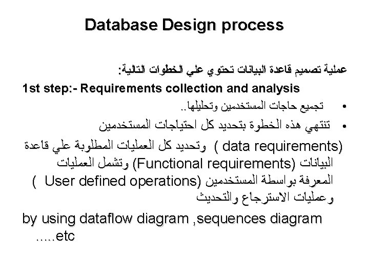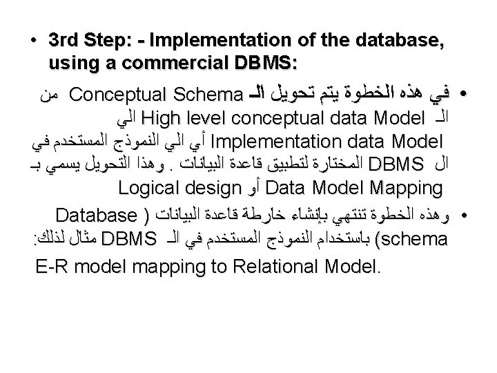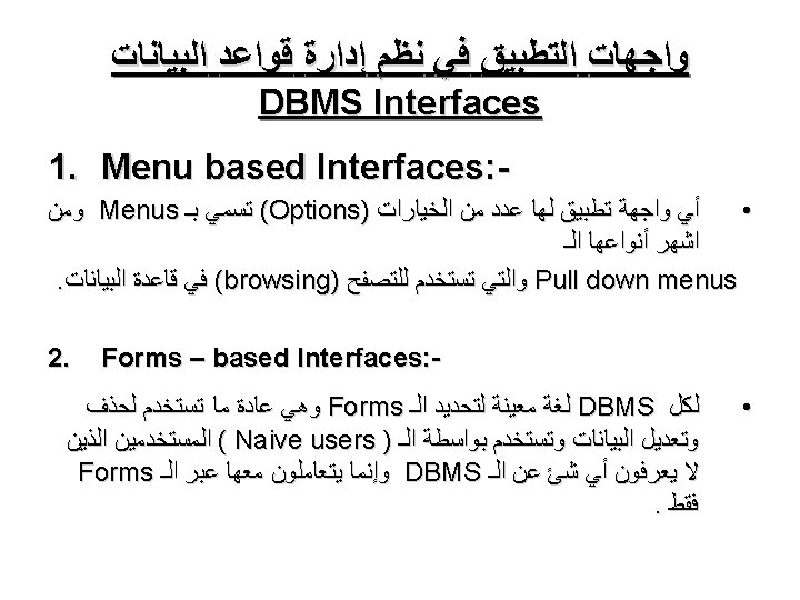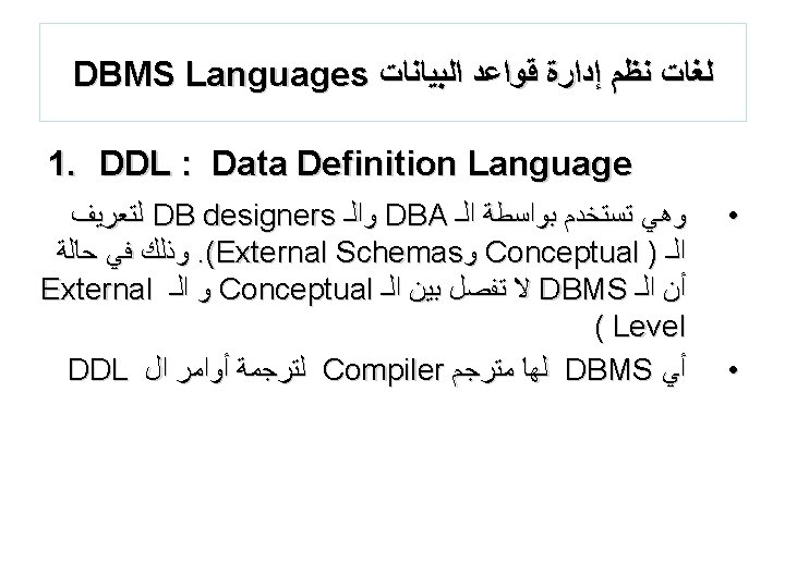 2. ﻋﺪﺩ ﺍﻟﻤﺴﺘﺨﺪﻣﻴﻦ (Number of users supported by the system) ● DBMS ﺃﻤﺎ ﺍﻟـ ● ● Single user system (one user at the time using DB) ﺃﻮ Multiuser system (more than one user at a time concurrently) (Needs concurrency control)