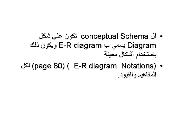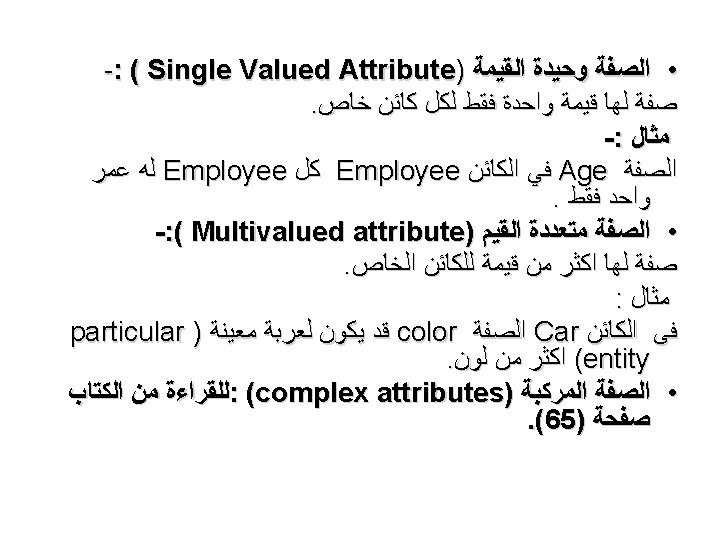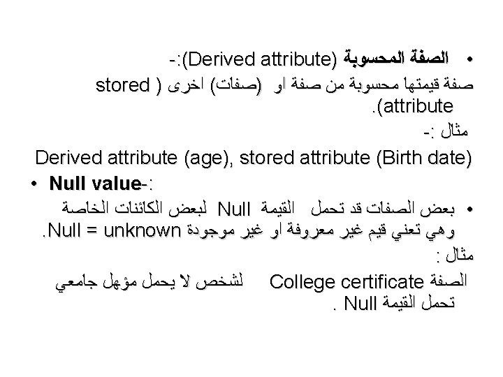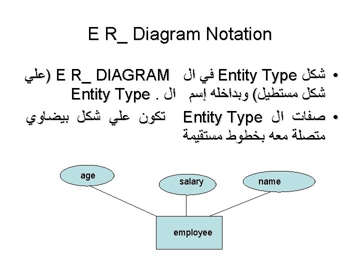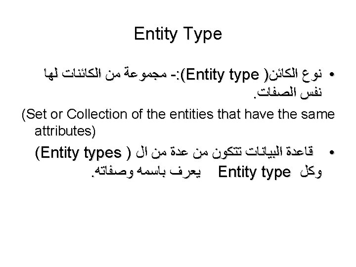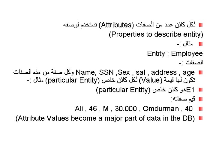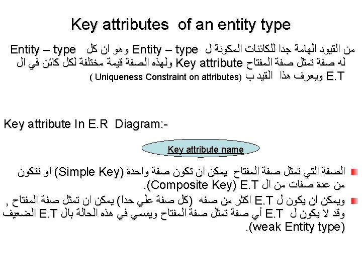 Value sets (Domain) ﻟﻬﺎ ﻣﺠﻤﻮﻋﺔ ﻣﻦ ﺍﻟﻘﻴﻢ ﺍﻟﺘﻲ ﻳﻤﻜﻦ ﺍﻥ ﺗﺎﺧﺬﻫﺎ ﺗﺴﻤﻰ E. T ﺃﻲ ﺻﻔﺔ ﻣﻦ ﺻﻔﺎﺕ ﺍﻝ . ( ﻟﻬﺬﻩ ﺍﻟﺼﻔﺔ Domain or Value sets ) ﺑﺎﻟﻤﺠﺎﻝ Value sets can’t be displayed In E-R diagram (Value sets (Domain ) + Key ) called attribute constraints in E-R model.