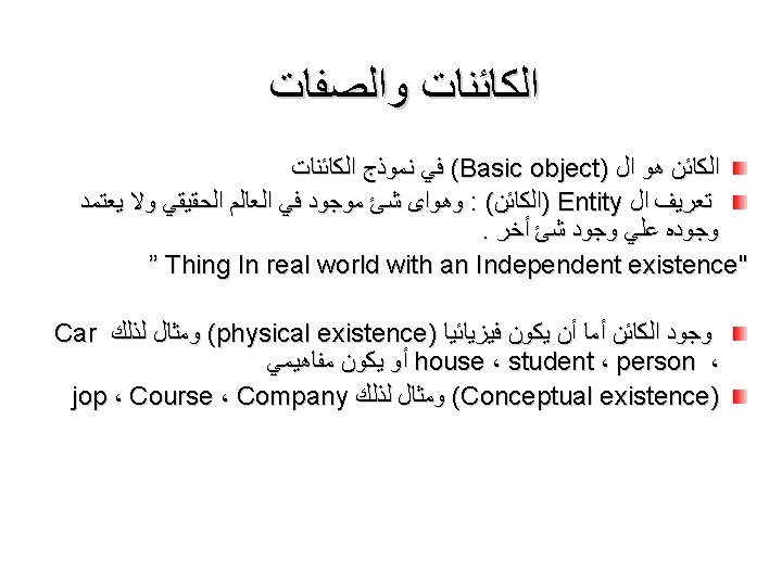 ENTITY RELATIONSHIP MODEL ﻧﻤﻮﺫﺝ ﺍﻟﻜﺎﺋﻨﺎﺕ ﺍﻟﻤﺮﺗﺒﻄﺔ Popular high_ level conceptual data Model , developed by Peter Chen (1976). -: ﺍﻟﻤﻔﺎﻫﻴﻢ ﺍﻷﺴﺎﺳﻴﺔ ﻟﻠﻨﻤﻮﺫﺝ Entities ﺍﻟﻜﺎﺋﻨﺎﺕ. 1 Attributes ﺍﻟﺼﻔﺎﺕ. 2 Relationships ﺍﻟﻌﻼﻗﺎﺕ. 3