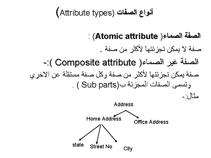 ﺃﺸﻜﺎﻝ ﺍﻧﻮﺍﻉ ﺍﻟﺼﻔﺎﺕ Multivalued attribute: - Composite attribute : Sub parts attribute Composite attribute name