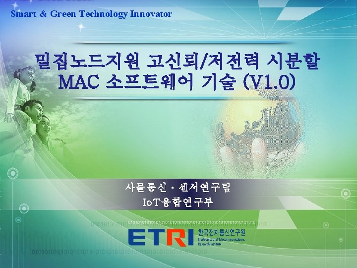 3. 기술 개요 (6) Low duty-cycling for Tag node Item Description Battery 2, 000 m. Ah x 2 ea MCU (MSP 430 F 5438) Active mode: 1. 12 m. A LPM 0: 0. 086 m. A RF Transceiver (CC 2420) Tx: 17. m. A Rx: 18. 8 m. A Idle: 0. 001 m. A Sensor None Duty cycle (0. 02 %) 5. 05 years Duty cycle (0. 003 %) 5. 27 years -8 -