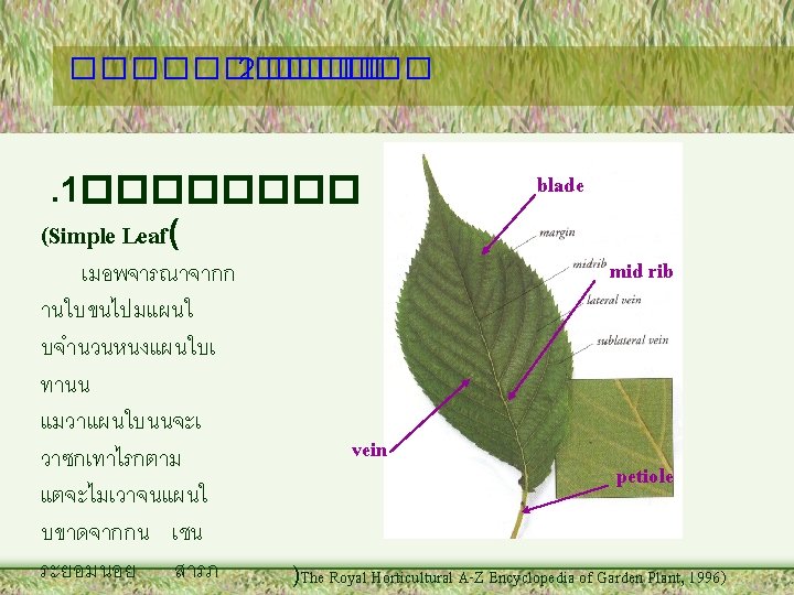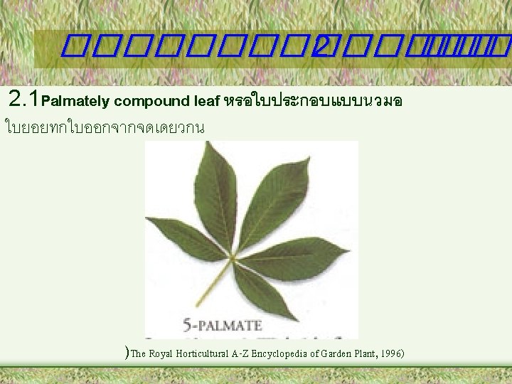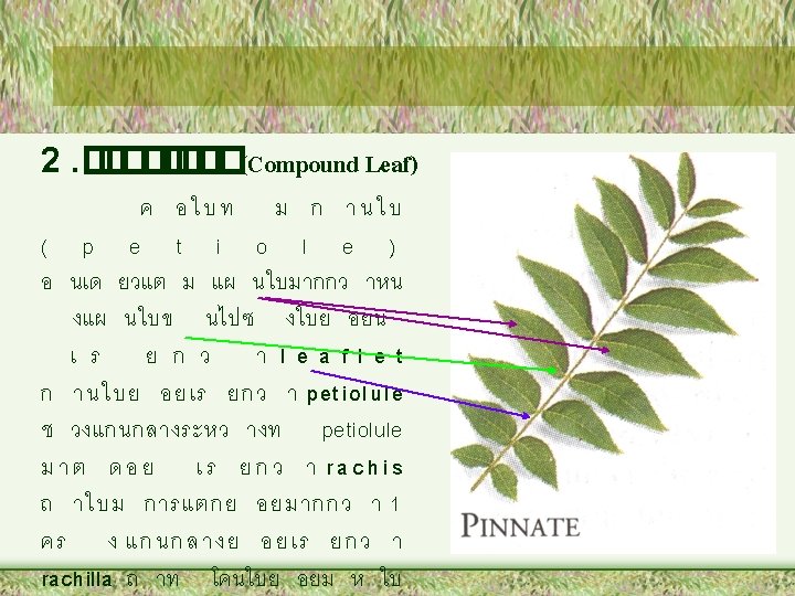 2 2 Pinnately compound leaf rachis rachis pinnate Slides: 7 Download presentation 2. 2 Pinnately compound leaf หรอใบประกอบแบบขนนก ใบยอยเรยงตวบนแกนกลาง (rachis) แบบขนนก ซงแบงยอยตาม จำนวน ครงของการแตกของ rachis ไดเปน pinnate, bi-pinnate, tri-pinnate ดงรป one-pinnate bi-pinnate tri-pinnate )The Royal Horticultural A-Z Encyclopedia of Garden Plant, 1996) one- �������� palmately ��� pinnately compound Leaf SIMPLE LEAF 3 -PALMATE 1 -PINNATE 5 -PALMATE 2 -PINNATE 9 -PALMATE 3 -PINNATE )The Royal Horticultural A-Z Encyclopedia of Garden Plant, 1996)
