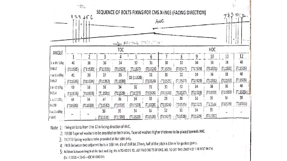 TABLE FOR SIMILAR FLEXURE, 1: 12 TURNOUT ON PSC Sle. No. Spacing on gauge face on tongue rail for ML side(A side) For all locations 549 23 spacing on gauge face of stock rail for ML side ( B side) Straight 550 12222 549 24 12249 12771 25 549 550 549 27 550 14418 548 28 550 549 550 549 550. 5 17749 550. 5 16713 552. 1 17248 551. 6 17783 551. 1 552. 1 551. 6 551. 1 16160 16697 17232 17768 552. 1 551. 6 551. 1 15608 16145 16681 17217 552. 1 551. 6 551. 1 15056 15594 16130 16667 17199 17711 549 550. 5 552. 1 551. 6 551. 1 14504 15042 15579 16116 16649 17162 33 550. 5 552. 1 551. 6 551. 1 13952 14490 15028 15566 16099 16613 32 550. 5 552. 1 551. 6 551. 1 13400 13939 14477 15015 15549 16064 31 550. 5 552. 1 551. 6 551. 1 12848 13387 13926 14465 14999 15515 30 550. 5 552. 1 551. 6 551. 1 12296 12836 13374 13914 14449 14966 29 550. 5 552. 1 551. 6 551. 1 4 degree 12284 12823 13364 13899 551. 6 551. 1 550. 5 3 degree 12272 12813 13349 13869 551. 1 550. 5 550 2 degree 12263 12799 13320 26 550. 5 550 549 1 degree 17265 552. 1 17800 551. 6 17817 552. 1 85