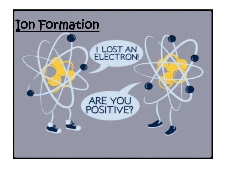 Other atoms: • gain or lose electrons in to achieve stability – Full valence shell (outermost shell) = stability • gaining or losing electrons makes atoms into ions – Metals lose electrons & form positive ions – Non-metals gain electrons & form negative ions – Ions have a similar electron arrangement to the nearest noble gas See pages 66 - 67