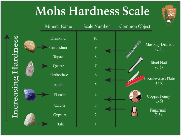 Hardness hardness: ability of a mineral to resist scratching Mohs hardness scale: scale against which the hardness of minerals is rated v 1 = softest v 10 = hardest strength of the bonds that make up a mineral’s structure determines the hardness of that mineral