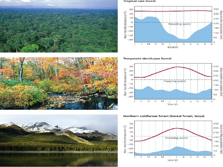 Temperate deciduous forest Characteristics: Temperate climate zone, distinct summer and winter seasons. Leaves fall off trees in the fall Temperature : ~10 ° C Precipitation: 7501500 mm Insolation: high – 2 nd highest after tropical rainforest