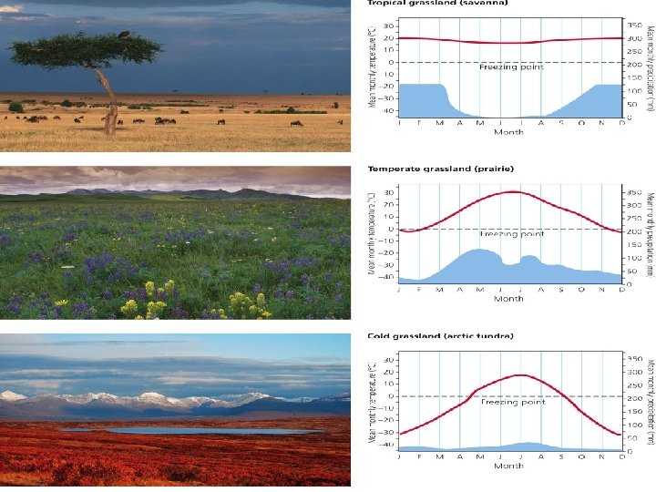 Grasslands Characteristics: Fairly flat areas dominate by grasses and herbaceous (nonwood) plants Temperature: -20°C in winter to 30°C in summer Precipitation: 250 mm – 1000 mm Insolation: Medium