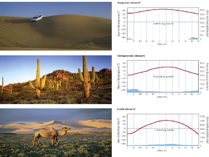 Deserts Characteristics: Very dry, hot days and cold nights. Little to no vegetation Temperature: 41°C During day to 0°C at night Precipitation: Less than 250 mm per year Insolation: High Limiting Factor: WATER