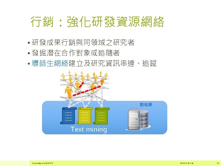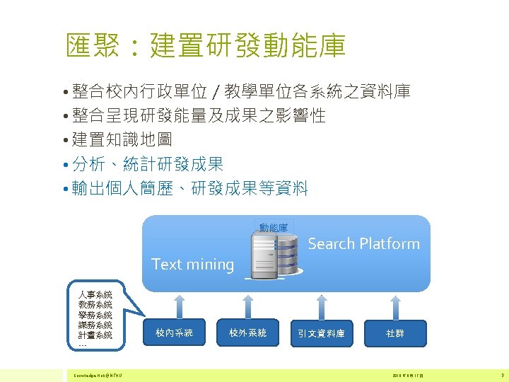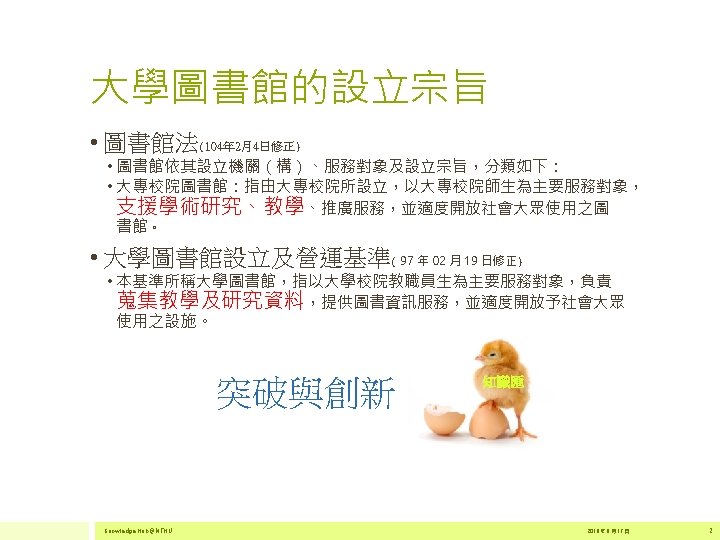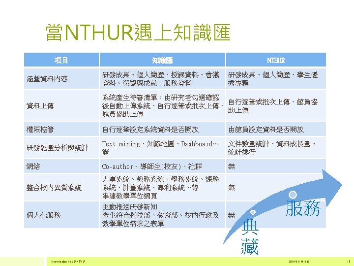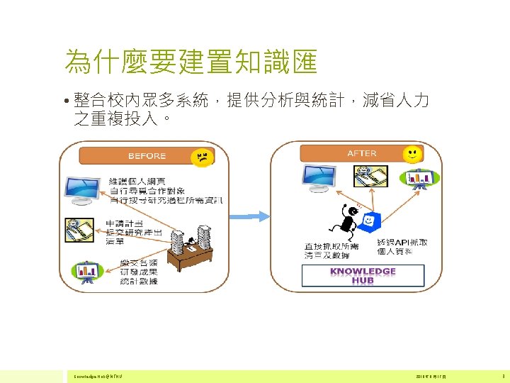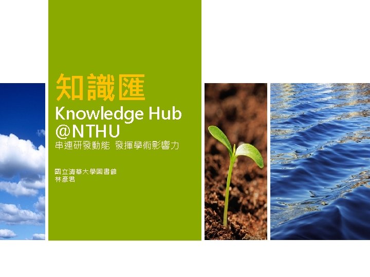 2 500 000 2 000 1 500 000 Slides: 17 Download presentation 為什麼要建置知識匯 • 在研究過程的不同環節,主動提供研究者服務。 2 500 000 主動 2 000 1 500 000 1 747 376 1 631 102 1 831 499 1 949 052 2 020 396 被動 1 000 500 000 2011 全球文獻數量 2012 2013 Source:http: //georgiasouthern. libguides. com/ETDs 2014 資料來源:SCOPUS Knowledge Hub@NTHU 2016 年 6 月 17 日 4 為什麼要建置知識匯 • 全球化的推波助瀾,跨國合作更能彰顯研究的能 見度 自食 其力 清華大學國際合作情形 協同 合作 Source: Sci. Val 2011 -2015 data extracted on June 6 th, 2016 Documents Citations per Publication Category Normalized Citation Impact 國際合著 4, 181 58, 711 14. 04 1. 63 國內合著 12, 126 133, 150 10. 98 0. 9 Source: In. Cites 2006 -2015 data extracted on June 7 th, 2016 Knowledge Hub@NTHU 2016 年 6 月 17 日 5 知識匯平台架構 Web Guest Researchers System Administrator Knowledge Hub@NTHU 2016 年 6 月 17 日 14 給知識匯創始教師~ • . You don't have to be great to start, but you have to start to be great. THANK YOU 感謝聆聽 yclin@lib. nthu. edu. tw 2012 17 年 7 月 22 日