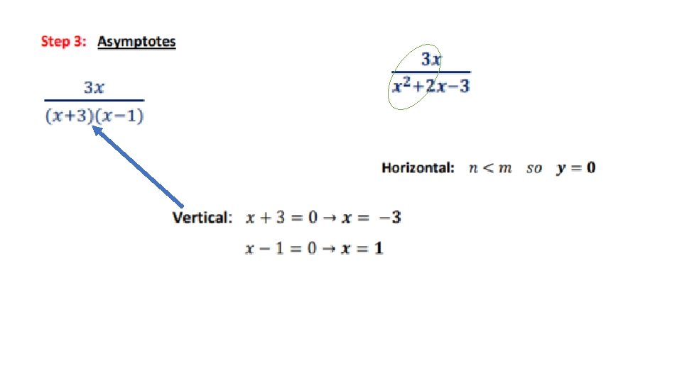 5. See if the graph passes through any of the nonvertical asymptotes. Set the rational function equal to the horizontal or oblique/slant asymptote If there are no solutions, then it does not cross the non-vertical asymptote