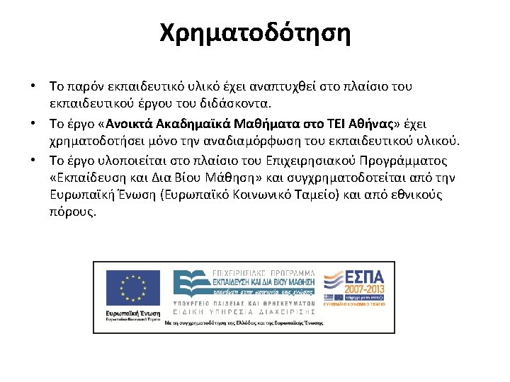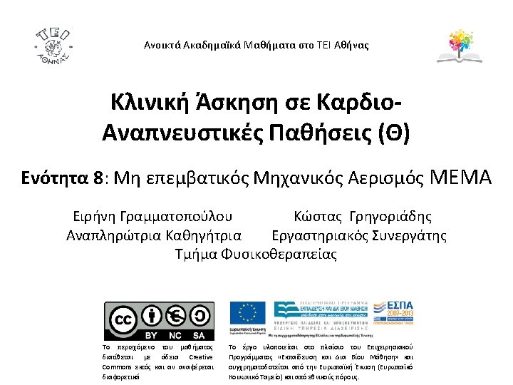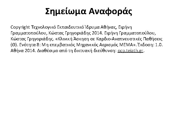 Σημείωμα Χρήσης Έργων Τρίτων (2/2) Το Έργο αυτό κάνει χρήση περιεχομένου από τα ακόλουθα έργα: 4. Antonelli, M. , et al. "Predictors of failure of noninvasive positive pressure ventilation in patients with acute hypoxemic respiratory failure: a multicenter study. " Intensive care medicine 27. 11 (2001): 1718 -1728, Σχήμα 1, Σχήμα 2. 5. Kramer, Naomi, et al. "Randomized, prospective trial of noninvasive positive pressure ventilation in acute respiratory failure. " American journal of respiratory and critical care medicine 151. 6 (1995): 1799 -1806, Σχήμα 3. 6. Antonelli, Massimo, et al. "A multiple-center survey on the use in clinical practice of noninvasive ventilation as a first-line intervention for acute respiratory distress syndrome*. " Critical care medicine 35. 1 (2007): 1825, Σχήμα 2, Σχήμα 3. 7. Albert, Scott P. , et al. "The role of time and pressure on alveolar recruitment. " Journal of Applied Physiology 106. 3 (2009): 757 -765. , Σχήμα 1.