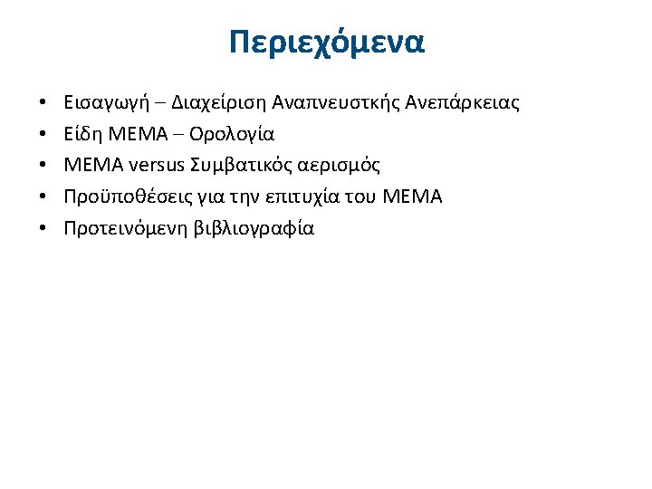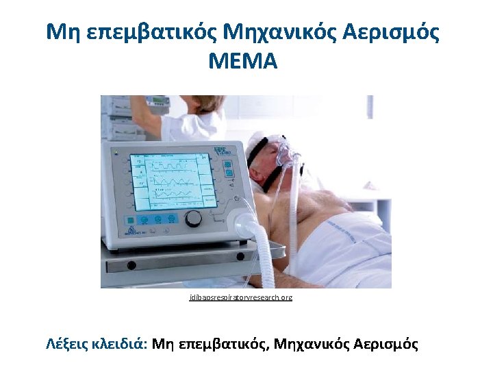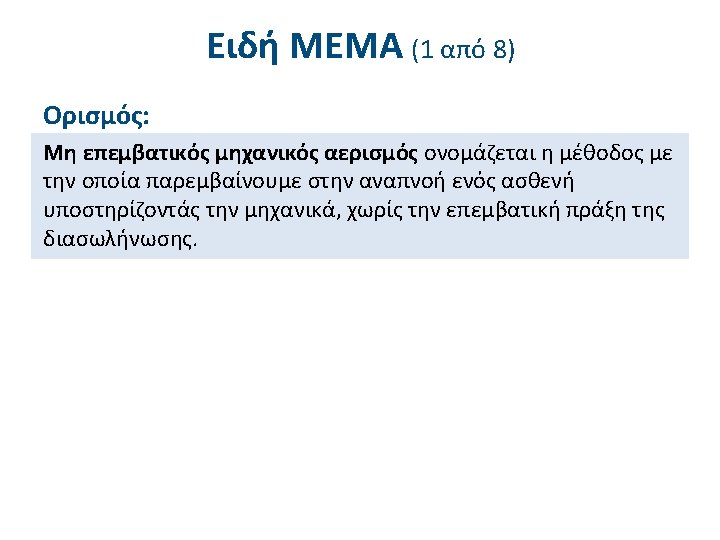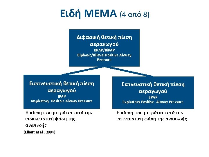 Ειδή ΜΕΜΑ (3 από 8) Μη επεμβατικός μηχανικός αερισμός Θετικής πίεσης NΙPPV Non-Invasive Positive Pressure Ventilation Συνεχής θετική πίεση αεραγωγού CPAP Continuous Positive Airway Pressure Κύριο χαρακτηριστικό η παράμετρος PEEP Positive End Expiratory Pressure (Elliott et al. , 2004) Διφασική θετική πίεση αεραγωγού BPAP/Bi. PAP Biphasic/Bilevel Positive Airway Pressure Κύριο χαρακτηριστικό η παράμετρος Pressure Support