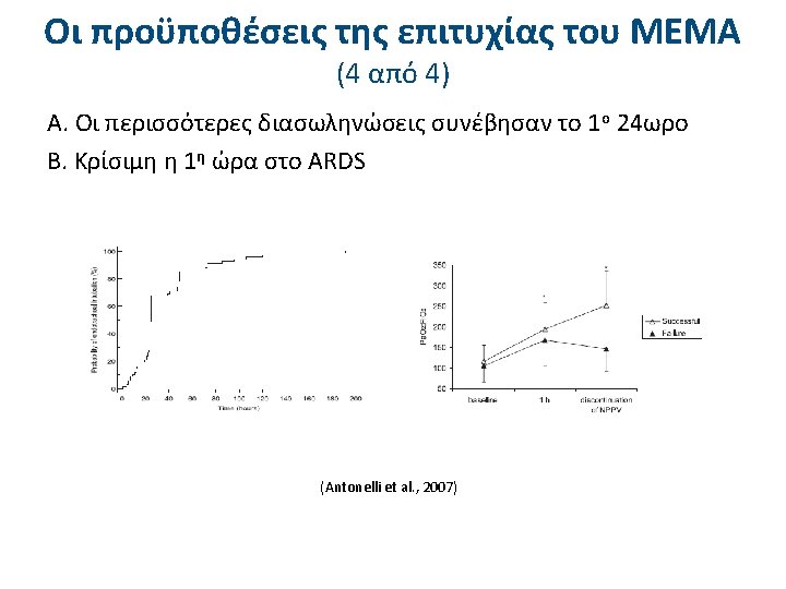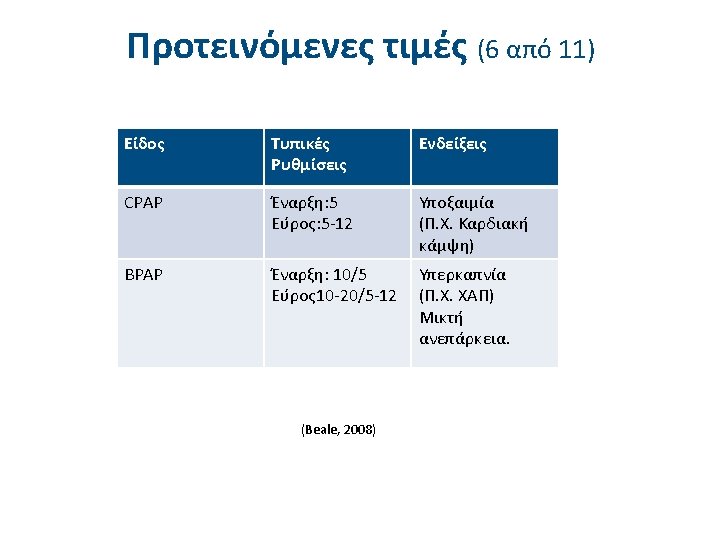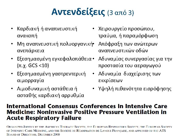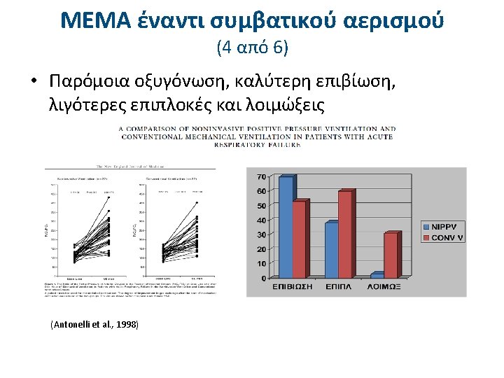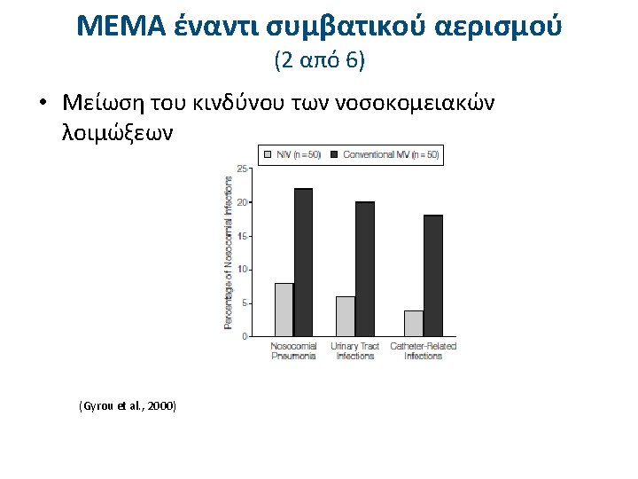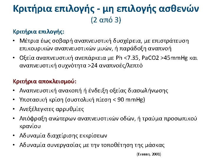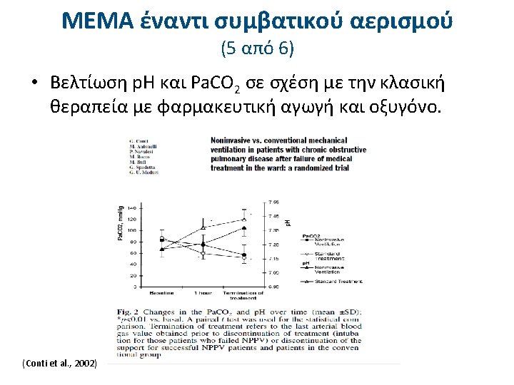 Συνηθέστερες τιμές ΜΕΜΑ (5 από 11) • PEEP 4 -5 cm H 2 O & PRESSURE SUPORT 6 -15 cm H 2 O (Holland et al. , 2003) • PRESSURE S 16± 2 & PEEP 5 cm. H 2 O (Conti, G. , et al. 2002) • PEEP 5 cm H 2 O & PRESSURE S 14. 8 ± 2 cm H 2 O(Squadrone et al. , 2004) • PRESSURE S 18+-4 & PEEP 6 ± 2 cm H 2 O (Phua et al. , 2005) • PRESSURE S INCR 2 -3 cm. H 2 O FOR 6 ML/KGR AND < 25 BR (Antonelli et al. , 2007) • PRESSURE S 8 -10 ML/KGR FOR 25 BR/MIN AND Fi. O 2 0. 6 (Antonelli et al. , 2001) • PRESSURE S 8 -10 ml/KGR AND 25 BR/MIN AND Fi. O 2 0. 6 (Antonelli et al. , 1998)