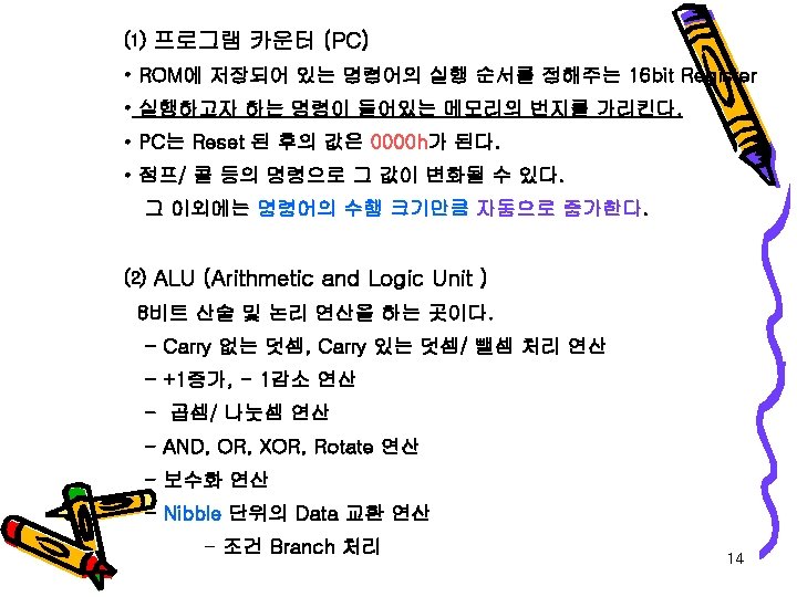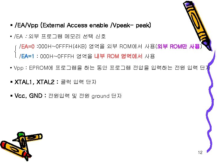 § RESET : Master Reset 입력으로 Active HIGH 신호 최소 두 개의 Machine Cycle 동안 High 상태가 유지될 때 유효. § ALE/ PROG (Address Latch Enable output/ PROGram pulse input ) 외부 Memory와 Interface할 때 하위 어드레스를 Latch하는데 사용되는 신호 EPROM을 프로그램 하는 동안에 프로그램 펄스( /PROG )가 입력된다. § /PSEN (Program Strobe ENable) 외부 ROM에서 Data를 읽을 때 출력되는 Active LOW의 Strobe 신호 외부 ROM의 OE(Output Enable) Pin에 연결된다. 11
