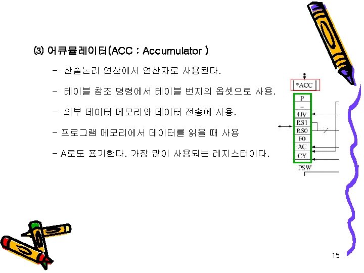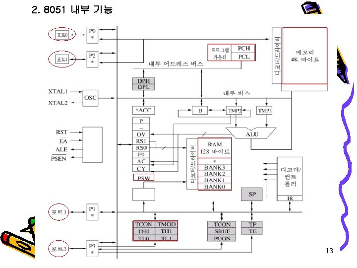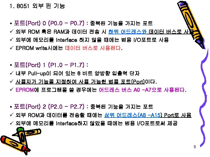 § 포트(Port) 3 (P 3. 0 - P 3. 7) : 중복된 기능을 갖는 포트 ü 내부 풀 업(Pull-up)을 갖는 8비트 양방향 입출력 단자(범용 I/O) ü 다른 목적을 가지는 다중기능 표 2. 4 포트 3의 다중 기능 포트 핀 다른 기능 P 3. 0 Rx. D (serial input port ) P 3. 1 Tx. D (serial output port ) P 3. 2 /INT 0 (external interrupt 0) P 3. 3 /INT 1 (external interrupt 1) P 3. 4 T 0 (T imer 0 external input ) P 3. 5 T 1 (T imer 1 external input ) P 3. 6 /WR (external data memory write strobe) P 3. 7 /RD (external data memory read strobe) 10