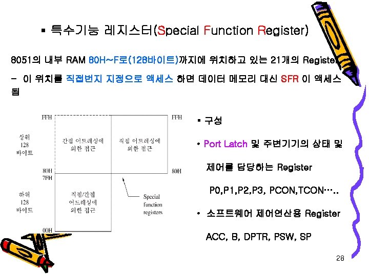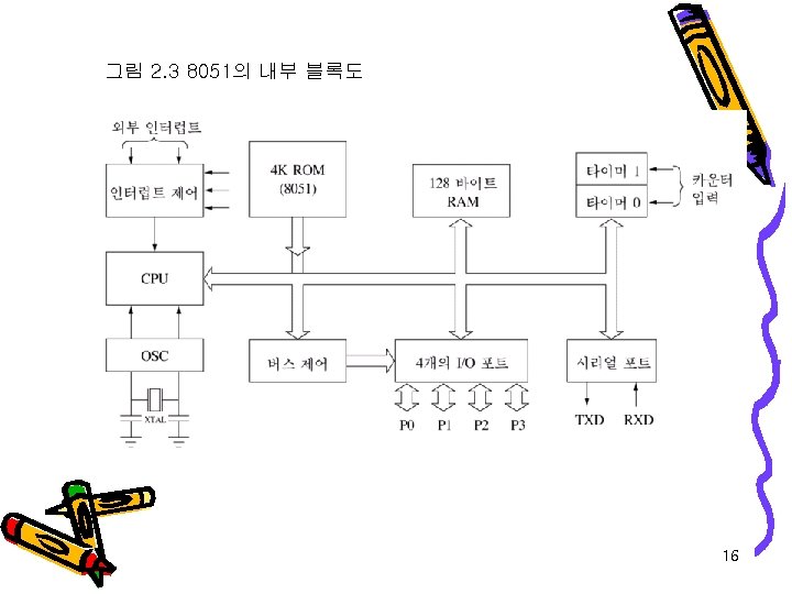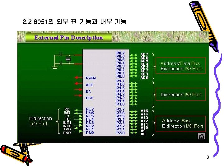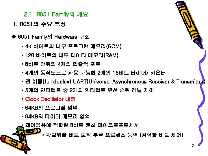 표 2. 2 Philips사에서 출시되는 8051 Family Pin ROM RAM 기타 기능 83 C 451 68 4 K 128 52 I/O, 2 timer, 1 UART 83 C 528 40, 44 32 K 512 32 I/O, WDOG, 3 -timer, UART, I 2 C bus 83 C 550 68 4 K 128 8 -8 bit. A/D, WDOG, 2 -timer, 1 UART 83 C 552 68, 80 8 K 256 48 I/O, 10 bit A/d, WDOG, 3 -timer, 1 UART, 2 PWM, I 2 C bus 89 C 51 Rx 2 40, 44 16, 32, 64 KF 128 ISP, IAP, more Interrupt, 32 I/O, 1 UART Low EMI, 2 nd DPTR, PCA …. 이름 5