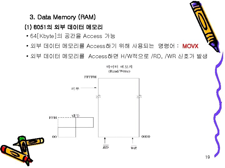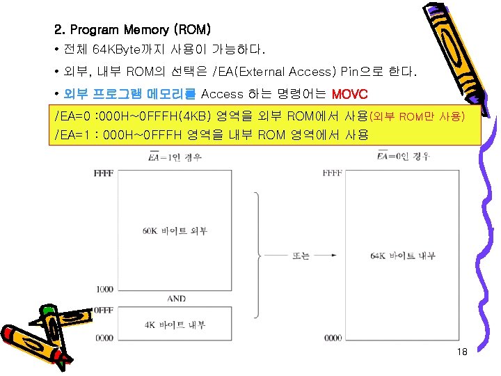 2. 3 8051 Memory 구조 1. Program과 Data Memory의 구조 /PSEN : ROM Access /RD, /WR : RAM Access 17