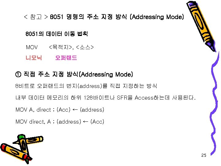 (2) 8051의 내부 데이터 메모리 • 데이터 RAM 영역 : 128 Byte(00 H~7 FH) • SFR (Special Function Register)영역 : 128 Byte (80 H~0 FFH) • MOV 명령에 의해서 Access가 가능하다. 20