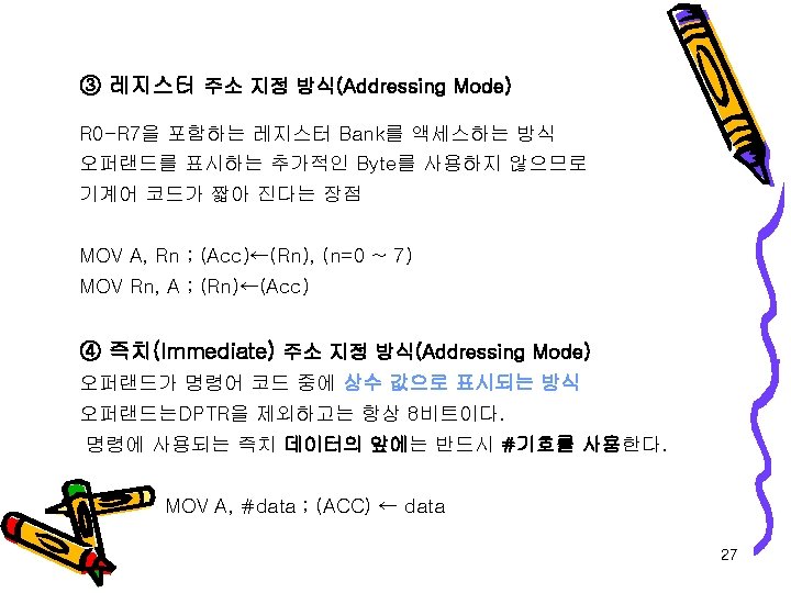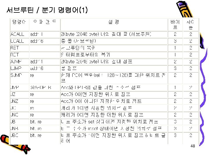 • • • • ; ARITH 4. ASM(곱셈) ORG MOV ; MOV MOV MUL ; MOV JMP 로 • END 4000 H PSW, #08 H ; BANK 1 선택 R 0, #9 R 1, #11 B, R 0 A, R 1 AB R 3, A R 2, B PSW, #0 H 0057 H ; BANK 0 선택 ; 모니터 프로그램으 53