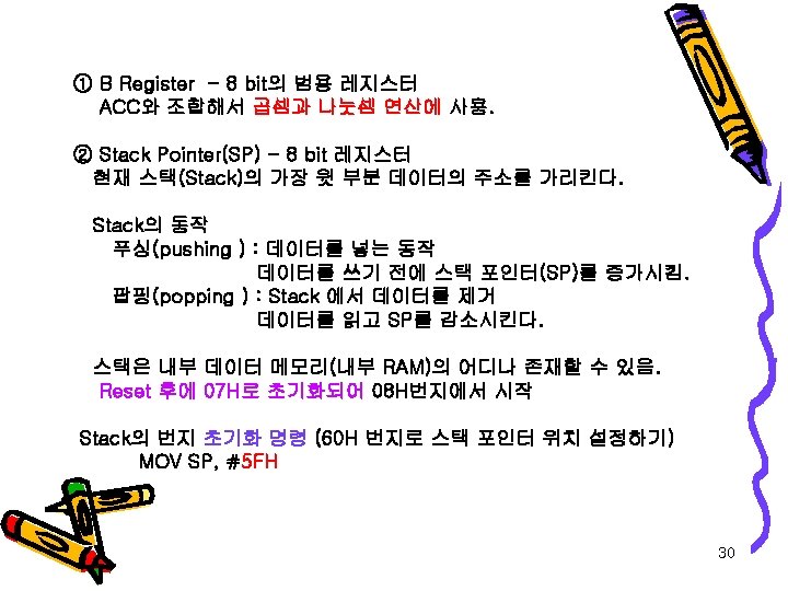 ④ DPTR(Data Pointer Register) • 16 Bit의 Register이다. • DPH, DPL로 나누어서 8 Bit로도 사용이 가능하다. • 외부 데이터 메모리(RAM)와 데이터를 주고 받을 때 Address Pointer로 사용 u 내부 기능 제어용 레지스터 • Timer/Counter TH 1, TL 1, TH 0, TL 0, TMOD, TCON • Serial Port SBUF, SCON, PCON • Interrupt Control IE, IP • I/O Port Control P 0, P 1, P 2, P 3 32
