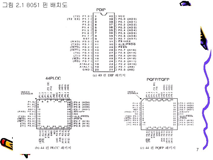 표 2. 3 Atmel사에서 출시되는 8051 Family 이름 Pin ROM RAM 기타 기능 89 C 51 40, 44 4 KF 128 32 I/0, 2 -timer, 1 UART 89 C 52 40, 44 8 KF 256 32 I/0, 2 -timer, 1 UART 89 C 55 40, 44 20 KF 256 32 I/0, 2 -timer, 1 UART 89 C 1051 20 1 KF 64 15 Programmable I/O, 2 -timer 89 C 2051 20 2 KF 128 1 UART, Analog Comparator 89 C 4051 20 4 KF 128 Same above 89 S 52 40, 44 8 KF 256 32 I/0, 3 -timer, 1 UART, WDOG, 2 DPTR 6