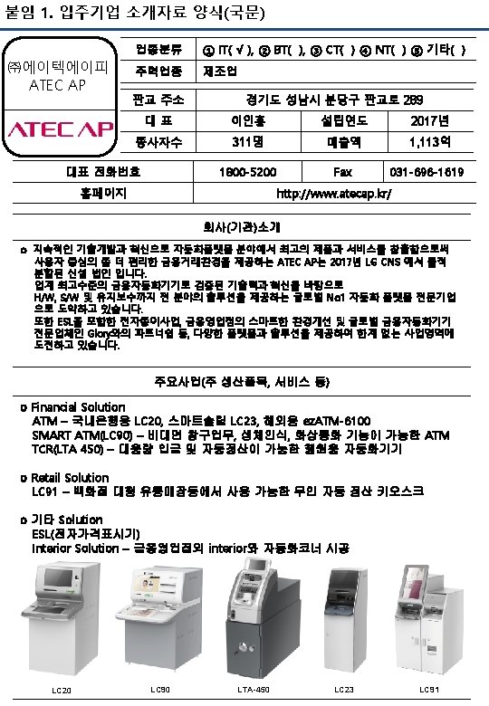 붙임 2. 입주기업 소개자료 양식(영문) ATEC AP Type of business ① IT( √ ), ② BT( ), ③ CT( ) ④ NT( ) ⑤ etc( ) A central business Manufacturing Pan-Gyo Address 289 Pangyo-ro, Bundang-gu, Seongnam-si Gyeonggi-do, Korea CEO In. Hong Lee Establishment year 2017 Number of employee 311 Sales $100 M Main Telephone number 1800 -5200 Homepage Fax 031 -696 -1619 http: //www. atecap. kr/ Corporate(institute) introduction o Based on proven technology as the best financial automation equipment in the banking industries and continuous innovation, we are making a new leap to become a Global No. 1 automation platform provider that provides solutions for all fields from H/W to S/W. We want to be your partner for your business by providing customized solutions. Main business(main product, service etc. ) o Financial Solution ATM – For domestic bank LC 20, Slim ATM LC 23, For overseas bank ez. ATM 6100 SMART ATM(LC 90) – Biometrics, Technical skill for video call TCR(LTA 450) – Optimized for branch transformation, which provide new experience , effectiveness and convenience to the customer. o Retail Solution LC 91 – Designed to meet the needs of retailers and offers convenience, reliability abd scalability o Other Solution ESL(Electronic shelf label) Interior Solution – Interior design for financial industries. LC 20 LC 90 LTA-450 LC 23 LC 91