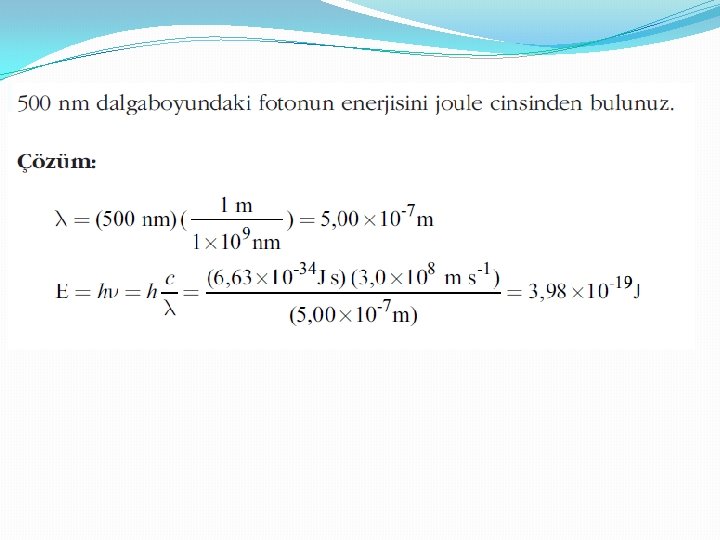 Örnek: Hidrojen spektrumunda n=3 enerji seviyesinden n=2 seviyesine olan elektron geçişini temsil eden çizginin frekansı ve dalga boyunu hesaplayınız. Çözüm: Daha önce verilen frekans formülü kullanarak bu hesaplama yapılabilir. olduğundan