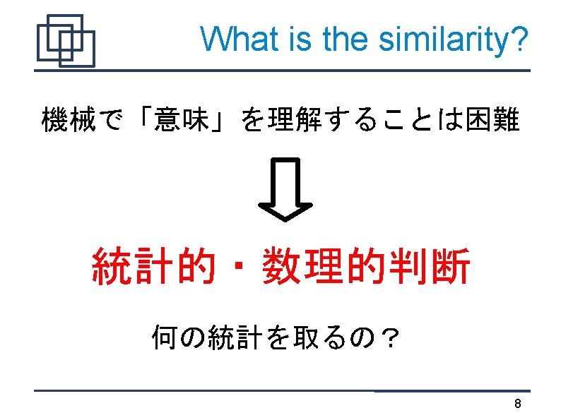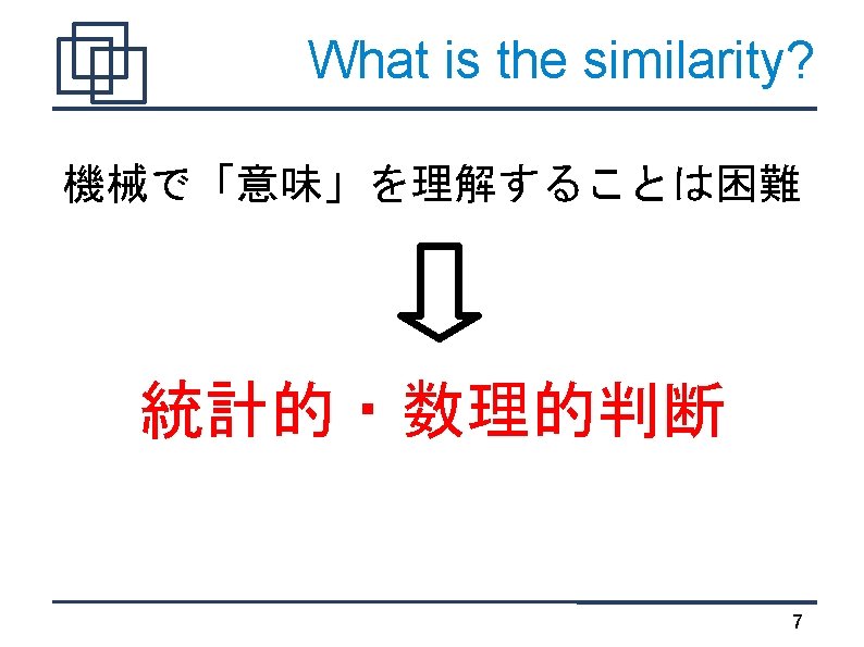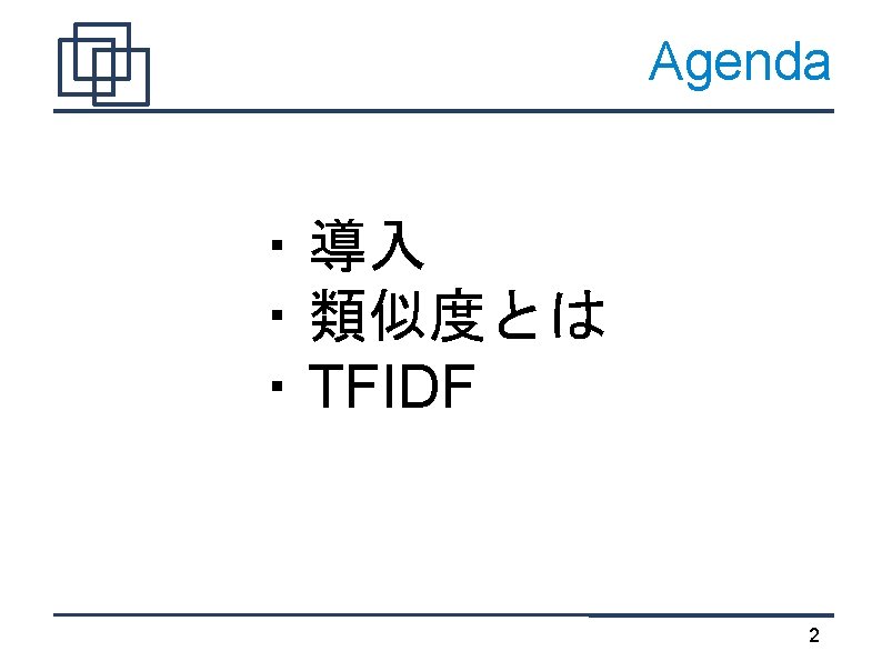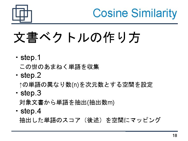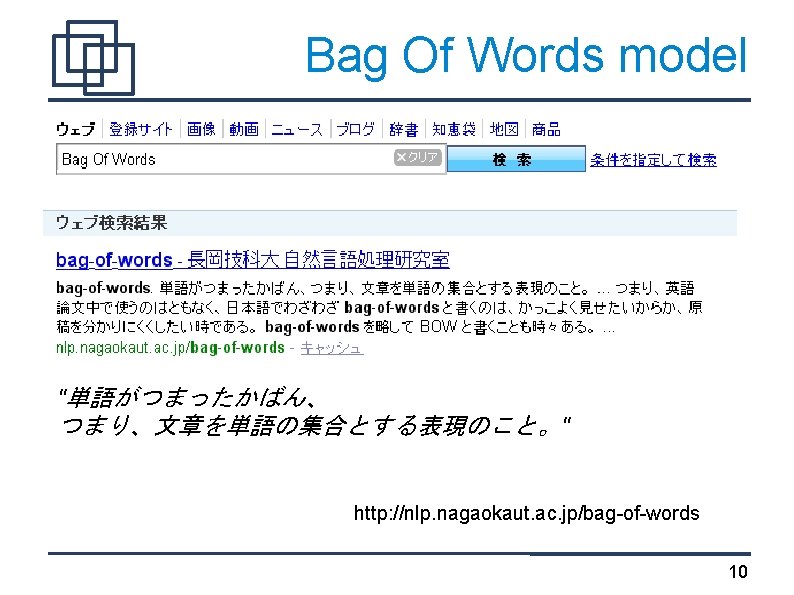 TF*IDF "索引語の重み付け方法のひとつ。 ・TF(Term Frequency)は文書dに置ける検索語tの頻度 ・IDF(Inverted Document Frequency)は索引語が現れる相対文 書頻度の逆数の対数" http: //nlp. nagaokaut. ac. jp/TF%E 3%83%BBIDF 23
