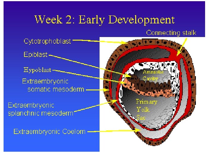 Second week: The week of twos • 2 trophoblast layers • Cyto • Embryoblast 2 layers • Epiblast • Extraembryonic mesoderm • Somatopleuric splanchnopleuric • 2 cavities • Amniotic syncytio hypoblast yolk sac