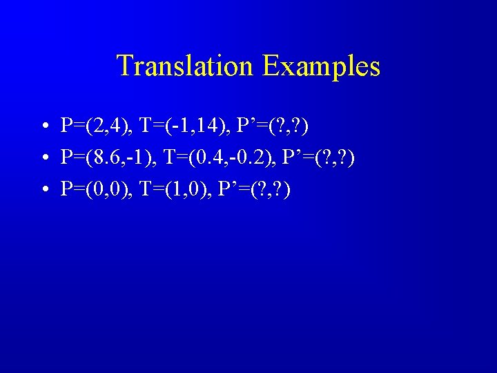 Translation • Translation - repositioning an object along a straight-line path (the translation distance) from one coordinate location to another. (x’, y’) (tx, ty) (x, y)