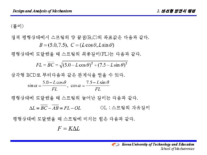 2. 비선형 방정식 해법 Design and Analysis of Mechanism 1. 비선형 방정식(Nonlinear Equation) • 선형방정식(Linear Equation)과 비선형방정식(Nonlinear Equation)의 차이는 ? 만족할때 중첩의 원리 (Superposition) 선형방정식 만족하지 않을 때 (a) 선형방정식 비선형방정식 (b) 비선형방정식 Korea University of Technology and Education School of Mechatronics