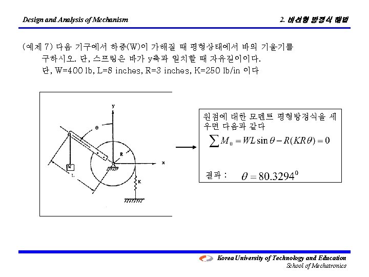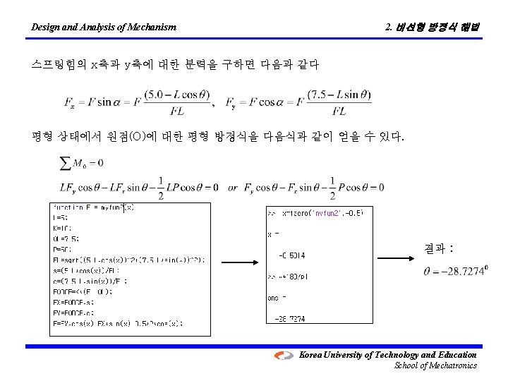 2. 비선형 방정식 해법 Design and Analysis of Mechanism (예제 4) 다음 비선형 방정식의 해를 MATLAB을 이용하여 구하시오. 해 Korea University of Technology and Education School of Mechatronics