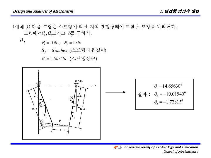 Design and Analysis of Mechanism 2. 비선형 방정식 해법 (예제 3) 다음 비선형 연립방정식의 해를 구하시 오. (풀이) 초기치 : Korea University of Technology and Education School of Mechatronics