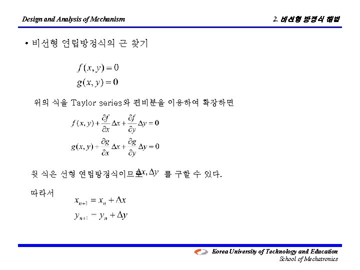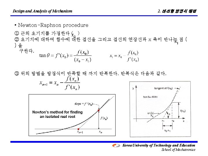 2. 비선형 방정식 해법 Design and Analysis of Mechanism 2. Newton Rapshon Method closed form 형태로 방정식을 구할 수 없을 때 수치해석적 방법을 이용하 게 되며 Newton Raphson방법은 잘 알려진 비선형 방정식을 풀 수 있는 기 법이다. Problem statement : Find the root of a function (Find the value such that ) Korea University of Technology and Education School of Mechatronics