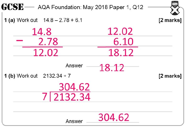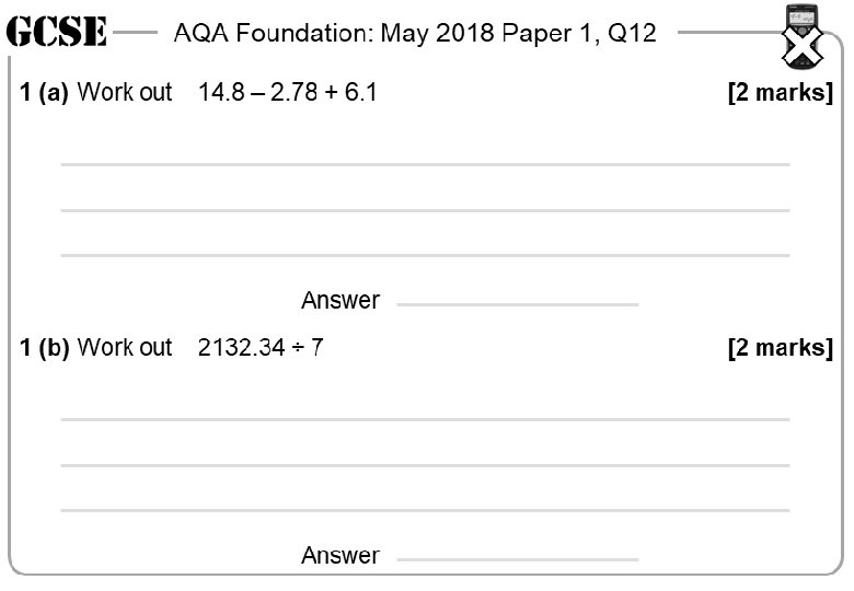 AQA Foundation: May 2018 Paper 1, Q 12 1 (a) Work out 14. 8 – 2. 78 + 6. 1 AQA Foundation: May 2018 Paper 1, Q 12 [2 marks] 1 (a) Work out Answer 1 (b) Work out 2132. 34 ÷ 7 [2 marks] 1 (b) Work out 2132. 34 ÷ 7 Answer [2 marks] AQA Foundation: May 2018 Paper 1, Q 12 [2 marks] 1 (a) Work out Answer 1 (b) Work out 2132. 34 ÷ 7 Answer AQA Foundation: May 2018 Paper 1, Q 12 14. 8 – 2. 78 + 6. 1 [2 marks] Answer 1 (a) Work out 14. 8 – 2. 78 + 6. 1 [2 marks] Answer [2 marks] 1 (b) Work out 2132. 34 ÷ 7 Answer [2 marks]