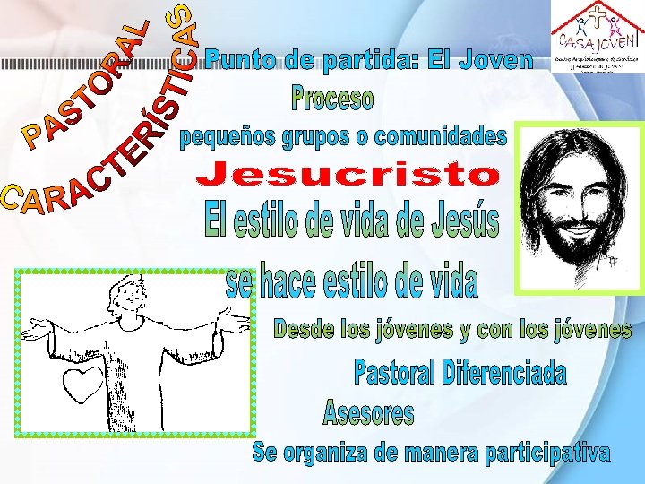 La Pastoral Juvenil es la acción organizada de la Iglesia para acompañar a los jóvenes a descubrir, seguir y comprometerse con Jesucristo y su mensaje para que, transformados en hombres nuevos, nuevos e integrando su fe y su vida, se conviertan en protagonistas de la construcción de la Civilización del Amor