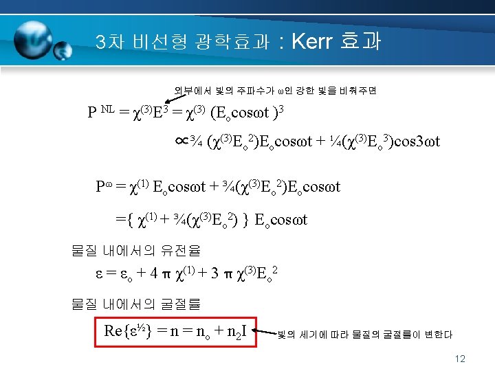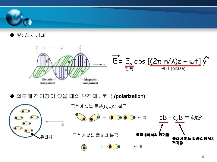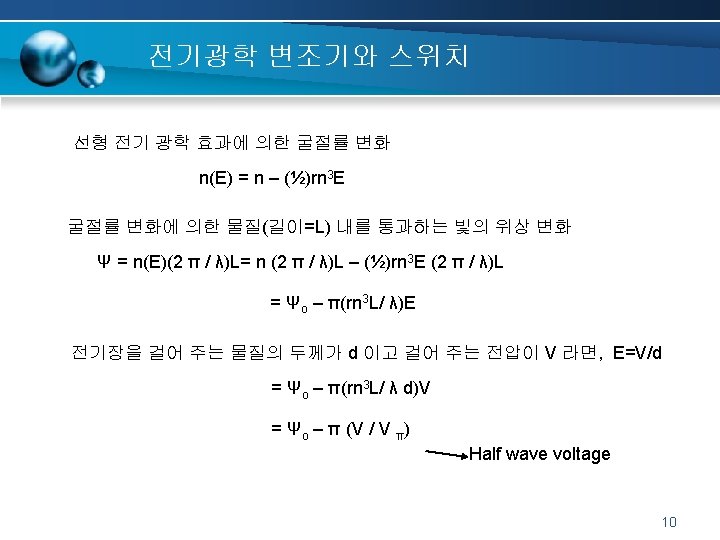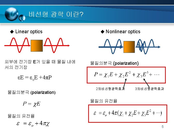2차 비선형 광학효과 : 선형전기광학효과 Electro-optic effect, Pockels effect, is the change in refractive index of a material induced by the presence of a dc (or low frequency) electric field. 6