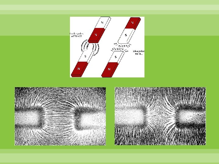 4. Linie pola magnetycznego. Występowanie uporządkowanego rozkładu opiłków żelaznych (małe dipole magnetyczne) nie tylko potwierdza istnienie pola magnetycznego, ale ponadto pokazuje kształt linii tego pola. a. wokół magnesu sztabkowego Pole magnetyczne magnesu sztabkowego; kierunek linii pola jest wyznaczony, zgodnie z umową, przez siłę działającą na biegun N magnesu próbnego.