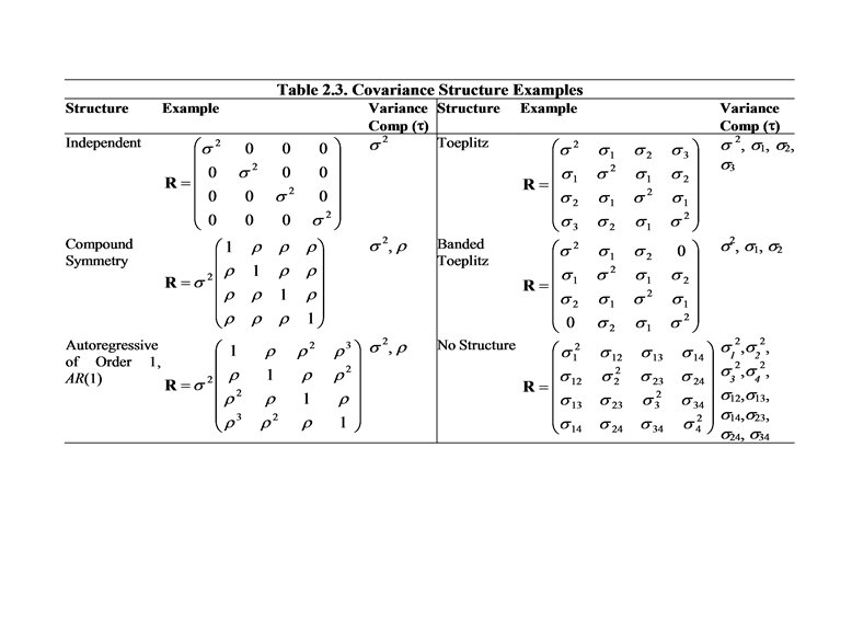 Temporal covariance matrix • For a full set of observations, let R denote the T T temporal (time) variance-covariance matrix. – This is defined by R = Var ( i) • Let Rrs = Cov ( ir, is) is the element in the rth row and sth column of R. – There at most T(T+1)/2 unknown elements of R. – Denote this dependence of R on parameters using R( ). Here, is the vector of unknown parameters of R. • For the ith observation, we have Var ( i ) = Ri( ), a Ti matrix. – The matrix Ri( ) can be determined by removing certain rows and columns of the matrix R( ). – We assume that Ri( ) is positive-definite and only depends on i through its dimension.