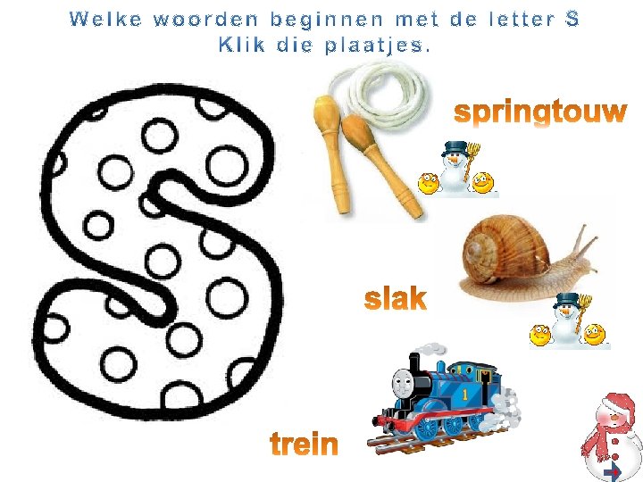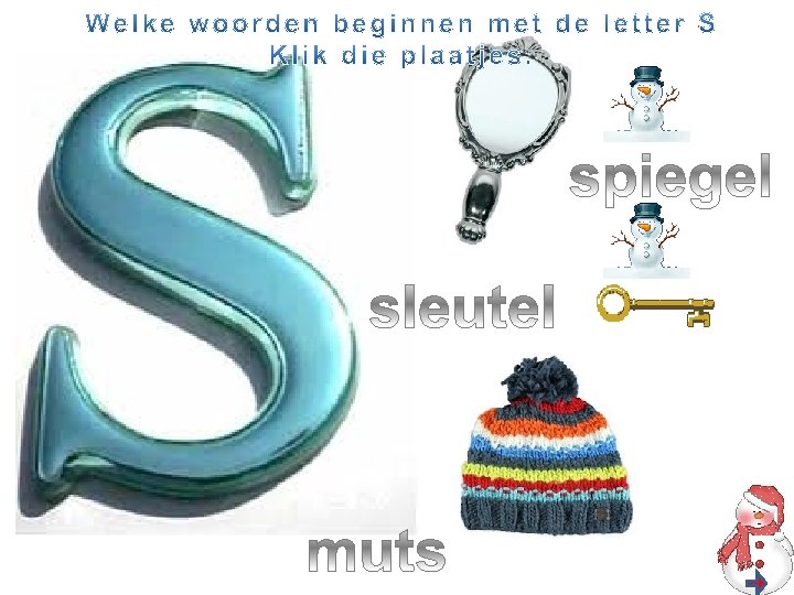 Klik op de sneeuwpop met de groene muts en paarse sjaal. De sneeuwpop heeft geen handschoenen aan.