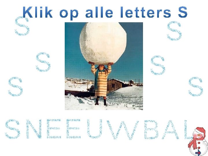 Klik op de sneeuwpop met de paarse muts en paarse sjaal. De sneeuwpop heeft blauwe handschoenen aan en hij heeft een bezem in zijn hand