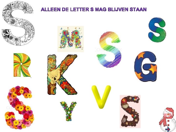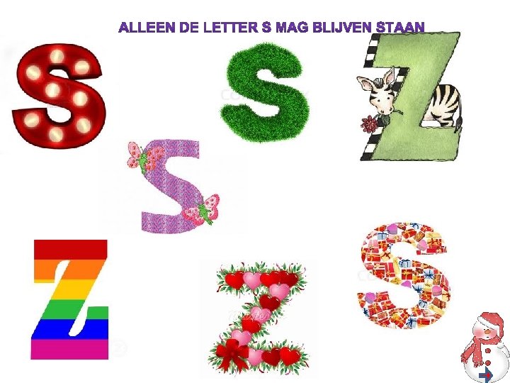 Klik op de sneeuwpop met de groen muts en paarse sjaal. De sneeuwpop heeft geen handschoenen aan en hij heeft geen bezem in zijn hand