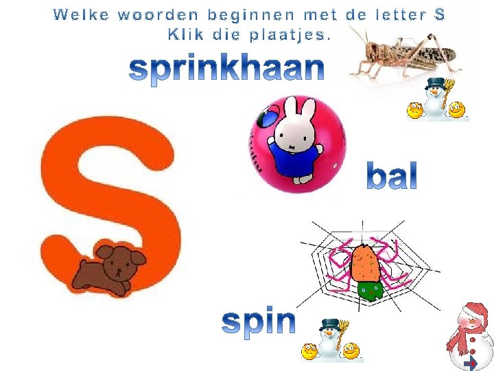 Klik op de sneeuwpop met de paarse muts en paarse sjaal. De sneeuwpop heeft groene handschoenen aan en hij heeft een bezem in zijn hand