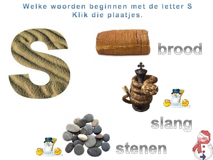 Klik op de sneeuwpop met de blauwe muts en paarse sjaal. De sneeuwpop heeft geen handschoenen aan en hij heeft een bezem in zijn hand.