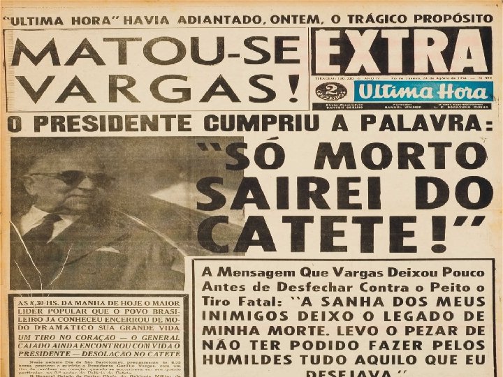 • CARTA TESTAMENTO DEIXADA POR VARGAS NO DIA DE SUA MORTE, EM 24 DE AGOSTO DE 1954 – cont. • Lutei contra a espoliação do Brasil. Lutei contra a espoliação do povo. Tenho lutado de peito aberto. O ódio, as infâmias, a calúnia não abateram meu ânimo. Eu vos dei a minha vida. Agora ofereço a minha morte. Nada receio. Serenamente dou o primeiro passo no caminho da eternidade e saio da vida para entrar na História. ” • ------------------------------- • (In: BOITO, A. O golpe de 1954. A burguesia contra o populismo. 2ª ed. São Paulo: Brasiliense, 1984)