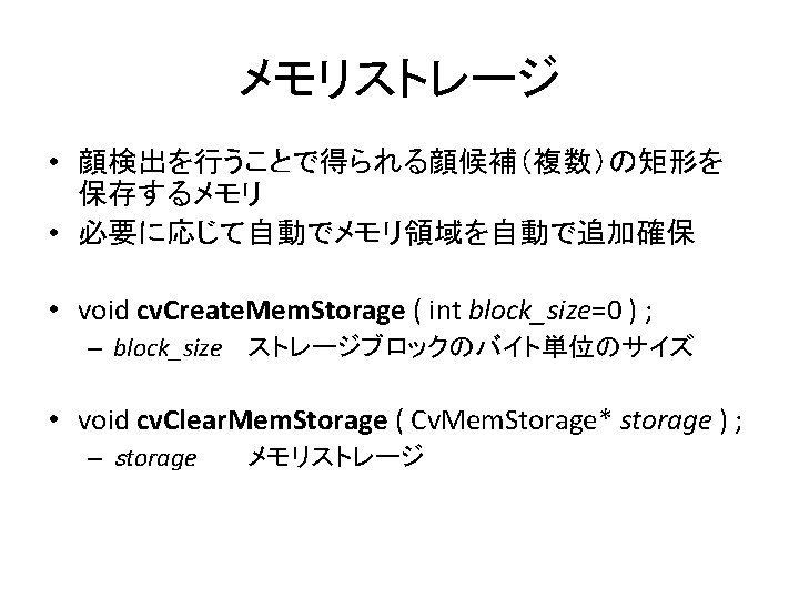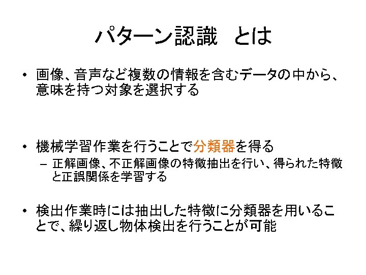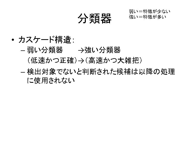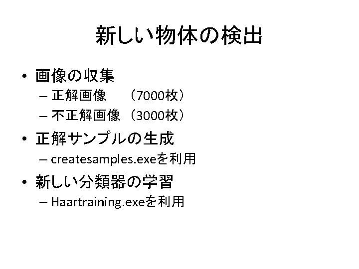 用意されている分類器 • カスケード構造 – – – – – 目 目(眼鏡有) 正面顔 正面顔(弱分類器 2個) 横顔 全身 下半身 上半身 :haarcascade_eye. xml :haarcascade_eye_tree_eyeglasses. xml :haarcascade_frontalface_default. xml :haarcascade_frontalface_alt 2. xml :haarcascade_profileface. xml :haarcascade_fullbody. xml :haarcascade_lowerbody. xml :haarcascade_upperbody. xml • 木構造 – 正面顔 :haarcascade_frontalface_alt_tree. xml (各カスケードの解像度に注意)